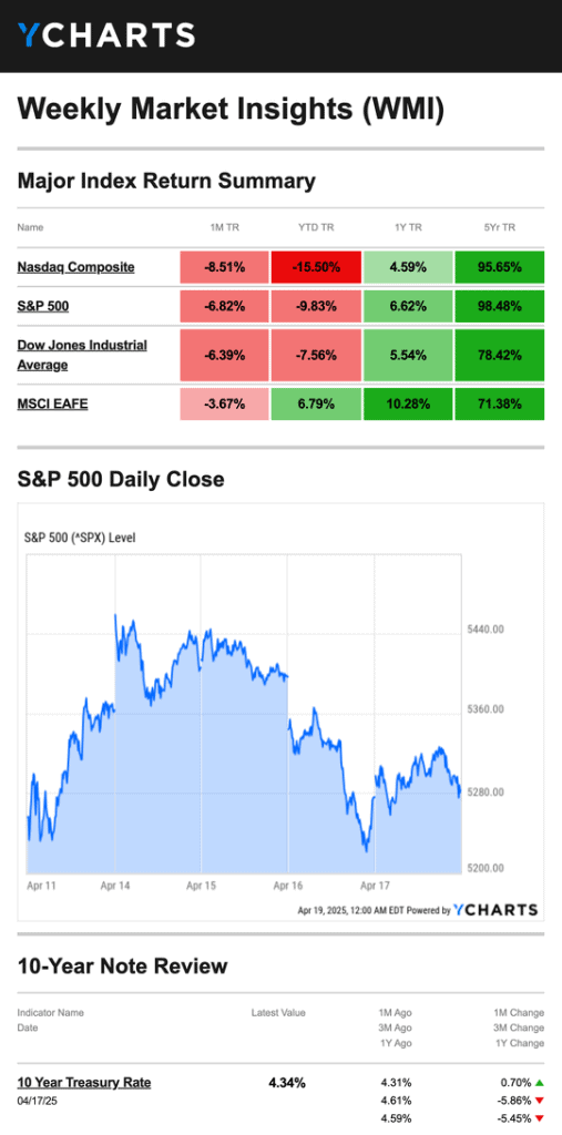 Source: YCharts.com, April 19, 2025. Weekly performance is measured from Monday, April 11, to Thursday, April 17. TR = total return for the index, which includes any dividends as well as any other cash distributions during the period. Treasury note yield is expressed in basis points.