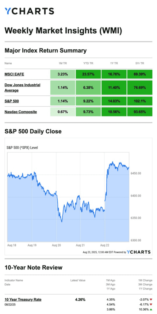 Source: YCharts.com, August 16, 2025. Weekly performance is measured from Monday, August 11, to Friday, August 15. TR = total return for the index, which includes any dividends as well as any other cash distributions during the period. Treasury note yield is expressed in basis points.