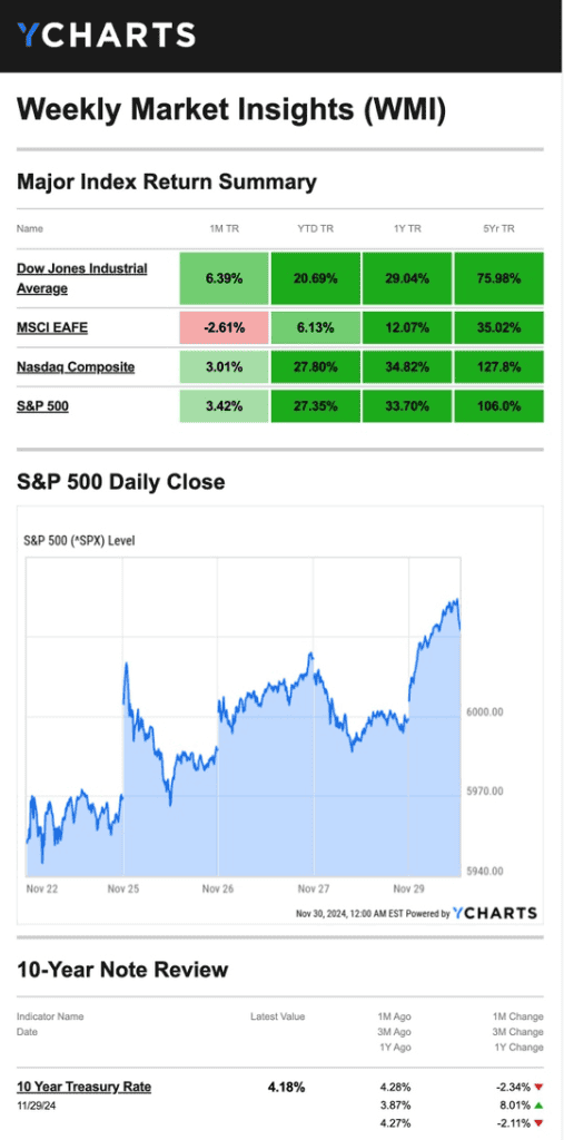 Source: YCharts.com, November 30, 2024. Weekly performance is measured from Friday, November 22, to Friday, November 29. TR = total return for the index, which includes any dividends as well as any other cash distributions during the period. Treasury note yield is expressed in basis points.