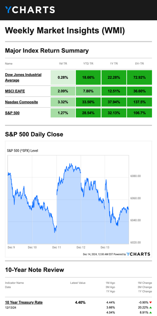 Source: YCharts.com, December 14, 2024. Weekly performance is measured from Monday, December 9, to Friday, December 13. TR = total return for the index, which includes any dividends as well as any other cash distributions during the period. Treasury note yield is expressed in basis points.