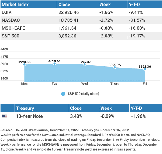 The half-point increase was widely anticipated, but the increase in the terminal rate (i.e., the point at which the Fed stops raising rates) rattled investors. Continued hawkishness by Fed Chair Powell at the post-meeting press conference added to investors’ anxiety. The potential for higher rates for longer, along with disappointing economic data, particularly a sharp decline in retail sales, amplified fears of a recession and sent stocks lower for the remainder of the week.