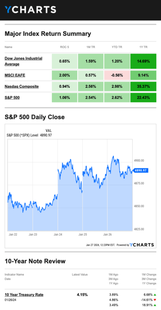 Source: YCharts.com, January 27, 2024. Weekly performance is measured from Monday, January 22, to Friday, January 26.