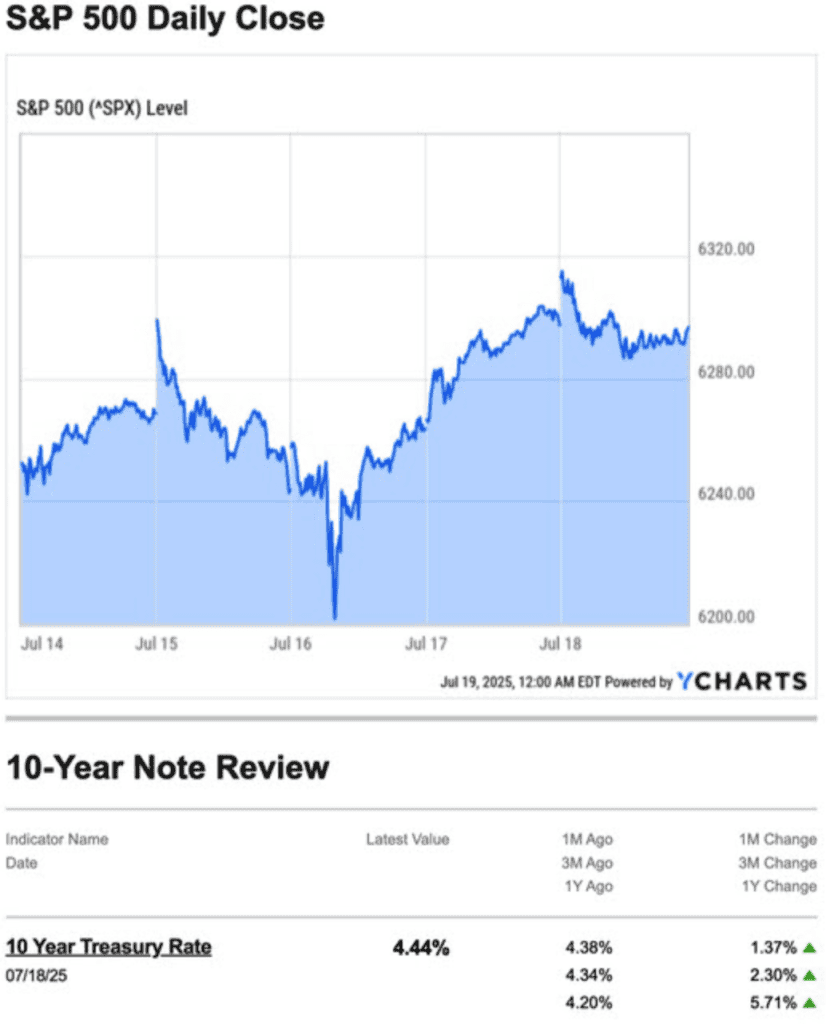Source: YCharts.com, July 19, 2025. Weekly performance is measured from Monday, July 14, to Friday, July 18. TR = total return for the index, which includes any dividends as well as any other cash distributions during the period. Treasury note yield is expressed in basis points.