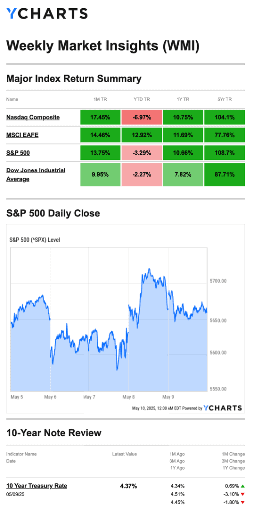 Source: YCharts.com, May 10, 2025. Weekly performance is measured from Monday, May 5, to Friday, May 9. TR = total return for the index, which includes any dividends as well as any other cash distributions during the period. Treasury note yield is expressed in basis points.