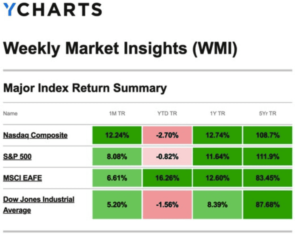 Source: YCharts.com, May 17, 2025. Weekly performance is measured from Monday, May 12, to Friday, May 16. TR = total return for the index, which includes any dividends as well as any other cash distributions during the period. Treasury note yield is expressed in basis points.