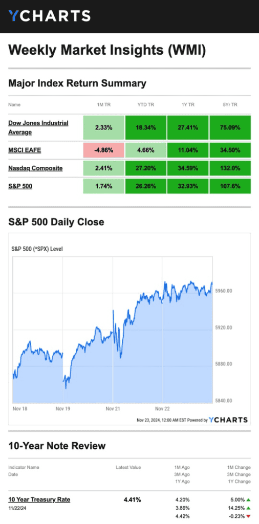 Source: YCharts.com, November 23, 2024. Weekly performance is measured from Monday, November 18, to Friday, November 22. TR = total return for the index, which includes any dividends as well as any other cash distributions during the period. Treasury note yield is expressed in basis points.