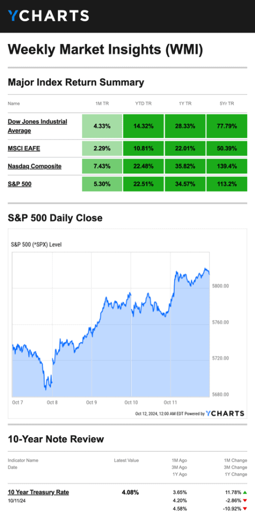 Source: YCharts.com, October 12, 2024. Weekly performance is measured from Monday, October 7, to Friday, October 11. TR = total return for the index, which includes any dividends as well as any other cash distributions during the period. Treasury note yield is expressed in basis points.