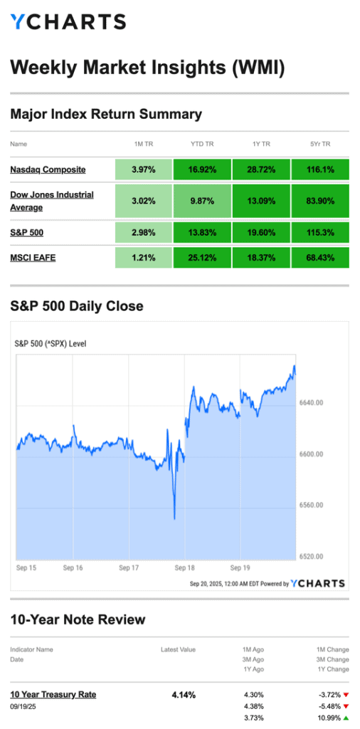 Source: YCharts.com, September 20, 2025. Weekly performance is measured from Monday, September 15 to Friday, September 19. TR = total return for the index, which includes any dividends as well as any other cash distributions during the period. Treasury note yield is expressed in basis points.