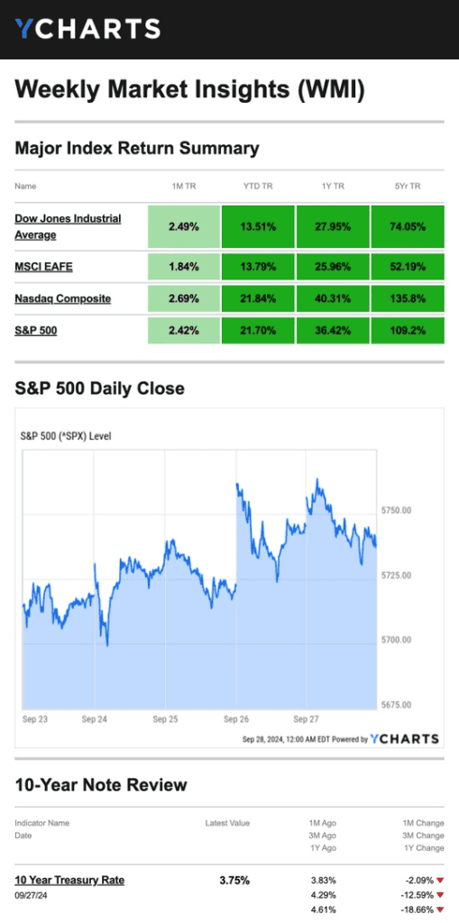 Source: YCharts.com, September 28, 2024. Weekly performance is measured from Monday, September 23, to Friday, September 27. TR = total return for the index, which includes any dividends as well as any other cash distributions during the period. Treasury note yield is expressed in basis points.